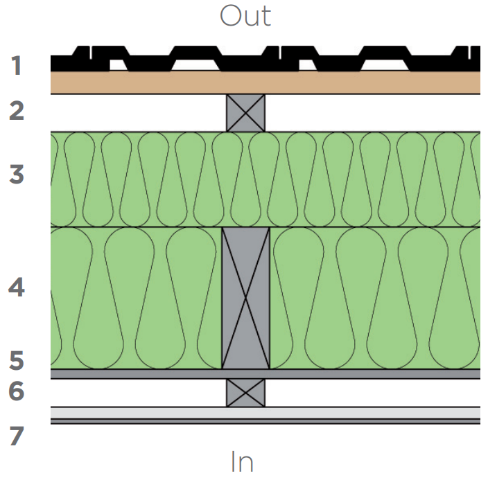 - Optional Plasterboard Finish: OSB with taped joints for airtightness OR PAVATEX DB 3.5 airtightness membrane under rafters. Battens to make Services Void, if required, and Plasterboard or Fermacell finishing board