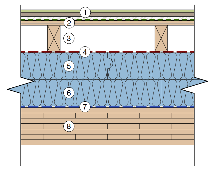 When insulating a flat roof with wood fibre, Soprema only recommends that a very well-ventilated roof comprising a 100mm cavity is installed. A minimum pitch of 3° is required for every flat roof construction to avoid standing water. Pavatex Isolair Multi wood fibre thermal insulation is ideal to use as External Roof Insulation over the rafters. The Isolair Multi boards must be protected with the Pavatex ADB Breather Membrane. The tongue and groove joints mean that there will be no thermal bypass through the junctions as often happens with square-edged insulation. The rafters can then be fully filled with Pavaflex or Pavatextil P flexible insulation to give an excellent U-value while also ensuring that the roof will be vapour-open to eliminate condensation accumulation. It is critical to install an airtightness membrane below the rafters to reduce a large amount of water vapour getting into the roof structure.